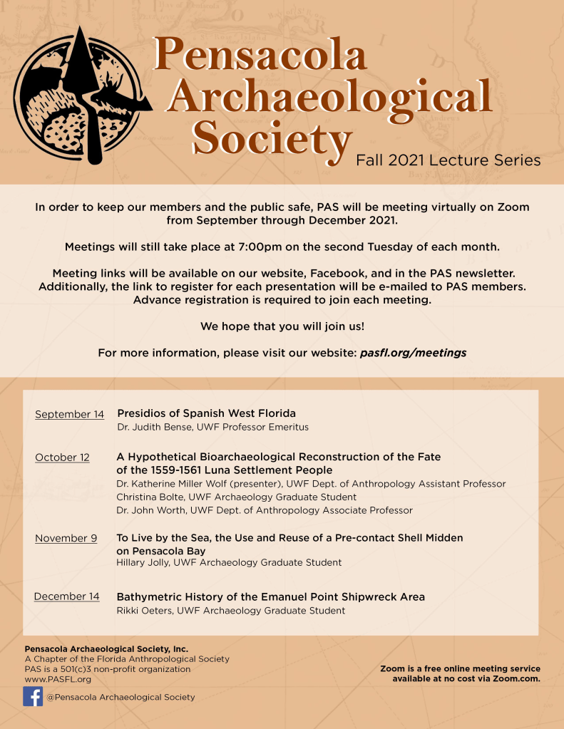 September 10: “Old Collections, New Stories: From Hawkshaw to You!” By Ellie Minette, UWF Graduate student/FPAN Lab Assistant, Barbara Wright, PAS President, Thomas Robinson, PAS Board Member, and Tara Ray, PAS Secretary, all FPAN NW volunteers.