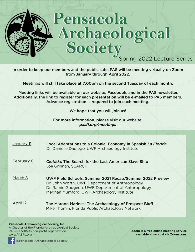 April 8: “UWF Archaeology Institute Update on Downtown Archaeological Research” By April Holmes, MA, RPA, Facility Research Associate, UWF Archaeology Institute.