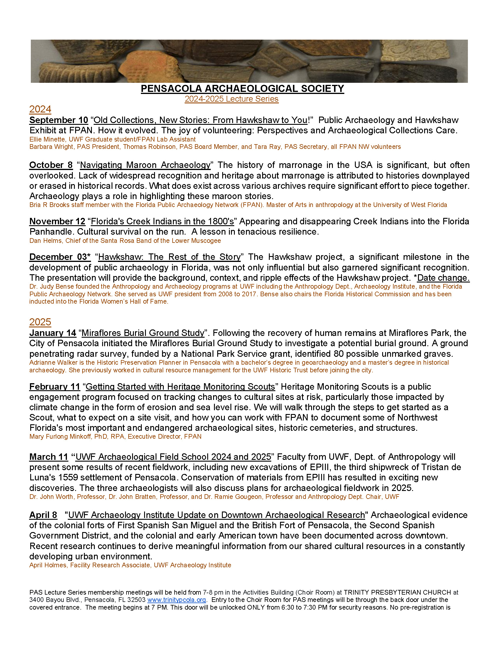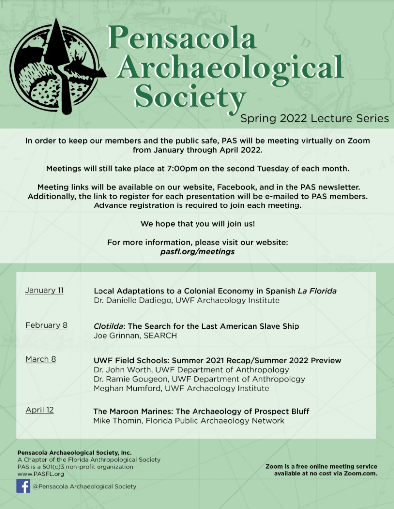 March 11: “UWF Archaeological Field School 2024 and 2025” By Dr. John Worth, Professor, Dr. John Bratten, Professor, and Dr. Ramie Gougeon, Professor and Anthropology Dept. Chair, UWF.
