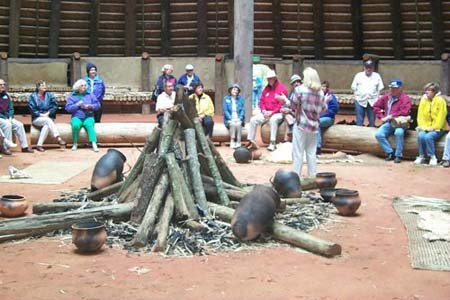 PAS members sitting inside the Native Meeting House at Mission San Luis while on an overnight field trip to Tallahassee.